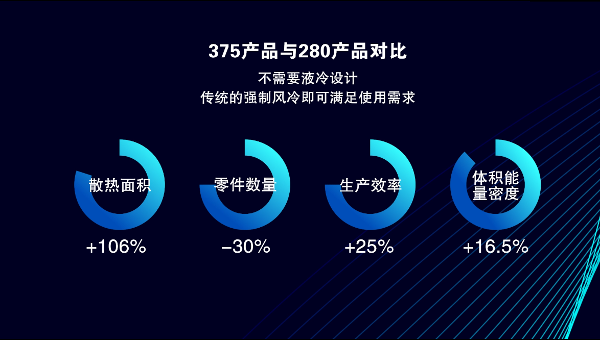 相比現有的280Ah產品,375Ah產品散熱面積提升了106%無需液冷設計,傳統的強制風冷即可滿足使用需求;